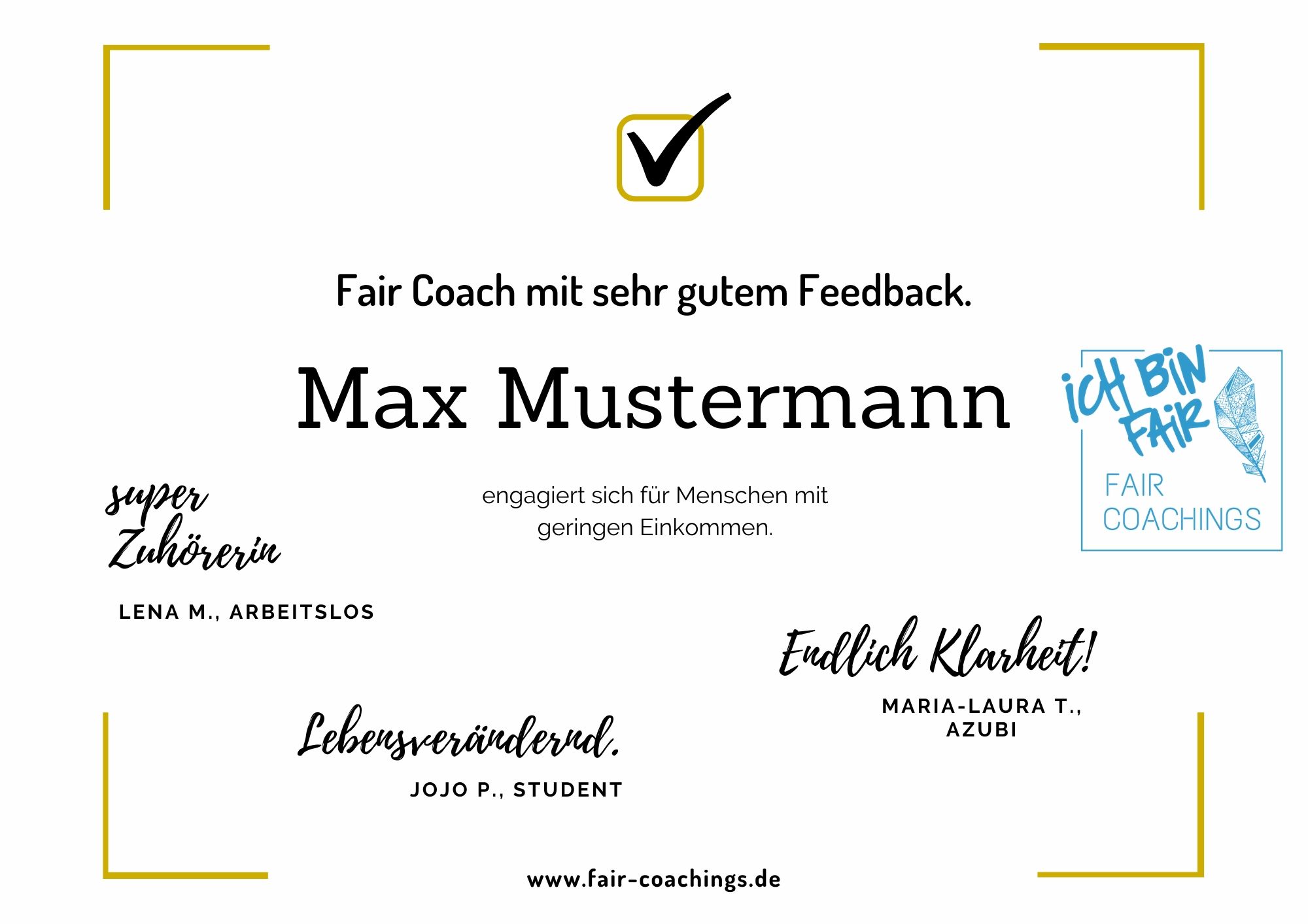 Du erhältst ein Fair-Coach Siegel, mit dem du direkt Vertrauensvorschuss bei potentiellen Kliente*innen gewinnen & dein soziales Engagement zeigen kannst.